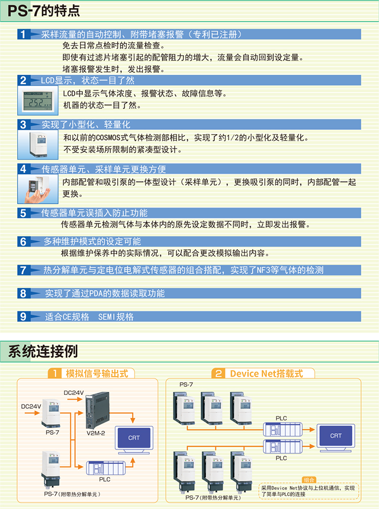 PS-7是一款通過更換傳感器單元可以檢測多種氣體,可通過PDA讀取數據。通過更換傳感器就可以檢測多種氣體的半導體材料氣體檢測器;傳感器經過校準和交付,無需現場氣體校準。此外,無需工具即可輕松更換傳感器;小巧輕便的設計;通過LCD顯示屏輕松了解氣體濃度,報警狀態和錯誤信息;采樣流量的自動控制功能;當插入與設置不同的傳感器時,傳感器具有防止錯誤插入的功能;通過連接PDA,可以獲取存儲在檢測單元中的數據;轉換器單元(選件)可用于檢測NF3和CCl2;符合CE標準;符合SEMI標準。產品用于石油化工、半導體制造等。