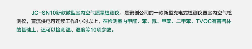 JC-SN10新款微型室內空氣質量檢測儀,是聚創公司的一款新型室內空氣檢測儀,是目前國內較少的一款充電式檢測儀器,其內置大容量鎳氫電池,交、直流兩用供電方式,直流供電可連續工作8小時以上,在檢測室內甲醛、苯、氨、甲苯、二甲苯、TVOC有害氣體的基礎上,還可以檢測溫、濕度等10項參數,是目前國內較少的一款十合一產品。